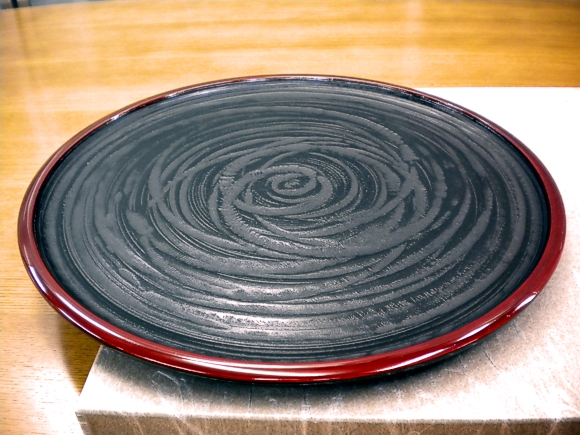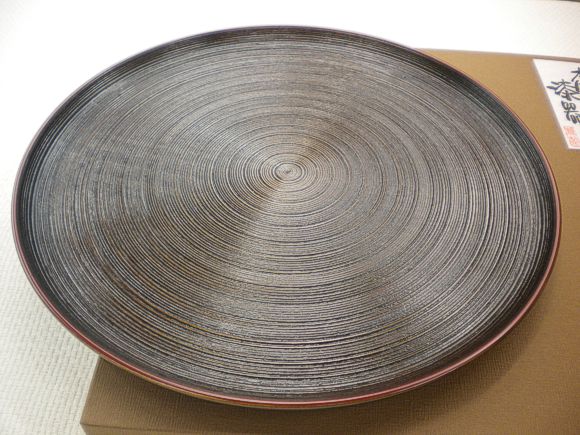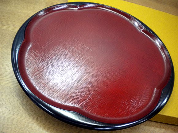 丸盆 山中塗 万葉糸目筋渕朱