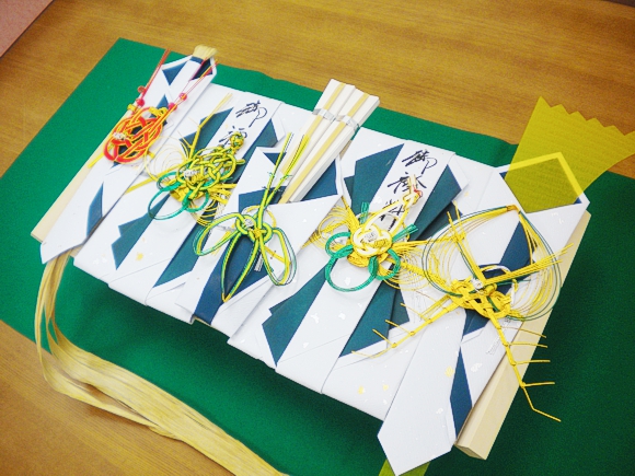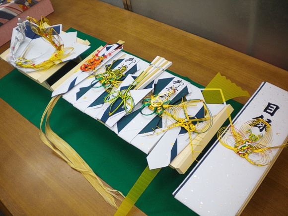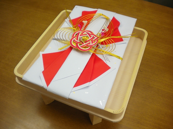 紙の色は、結納(女性から男性へ)が青色、結納返し(男性から女性へ)が赤色になります。