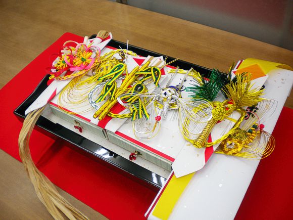 現在、結納飾りは略式でコンパクトなものが主流となり、五品または三品のセットが一般的です。