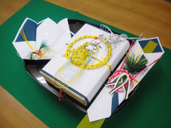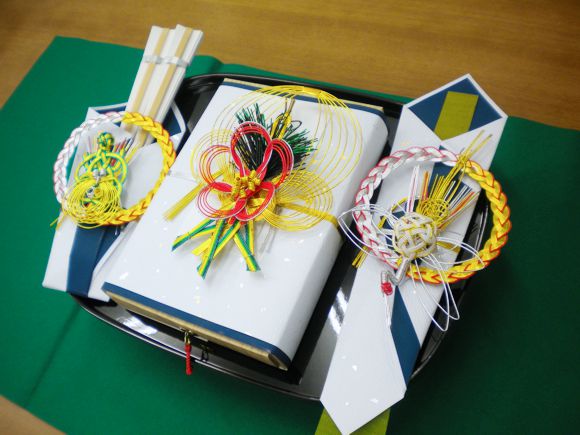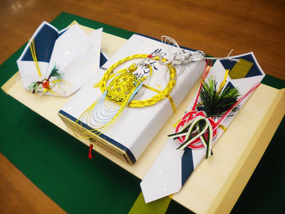 紙の色は、結納(女性から男性へ)が青色、結納返し(男性から女性へ)が赤色になります。