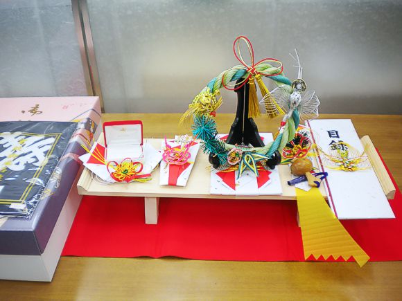 - 結納台は伝統的な白木台です。