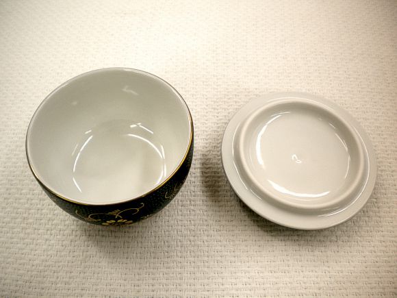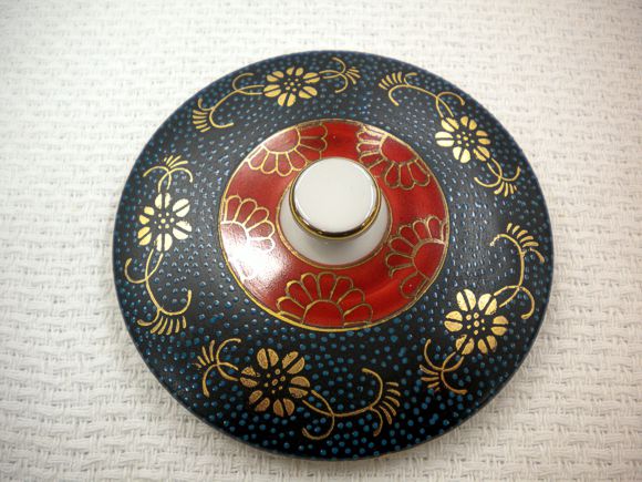黒地に青緑色の粒模様、金色の鉄仙が描かれています。