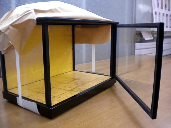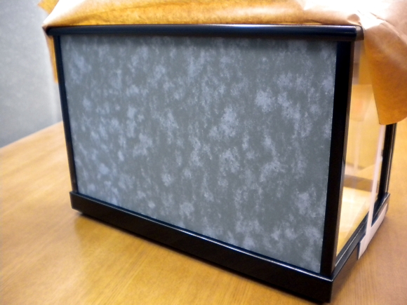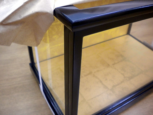 【形状】:木製ガラスケース、前開き、黒ツヤ消し塗り