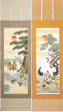 どちらの掛け軸でも構いませんが、左側の 「松竹梅高砂」 は夫婦和合と長寿を表わし、とくに婚礼時に縁起の良い掛け軸なので、できるだけ「松竹梅高砂」をおすすめします。