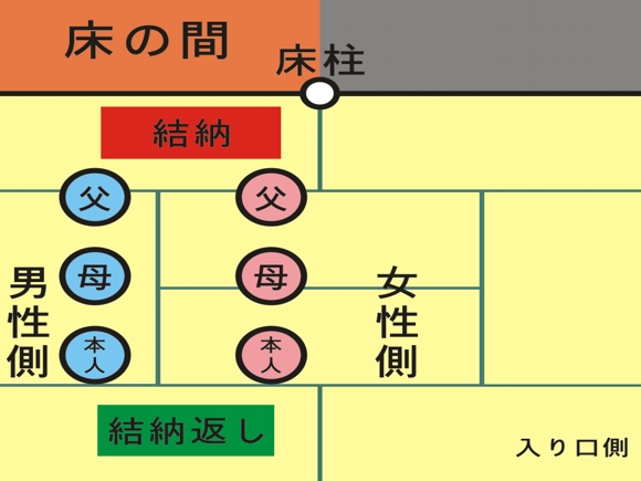 ● 仲人がある場合は、最上座(床の間に近い方) から 仲人(仲人夫妻) ・ 父 ・ 母 ・ 本人 の順