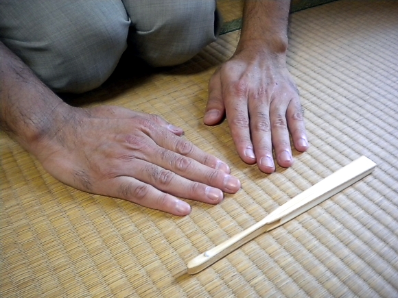 扇子より内側に両手をつき、一度、深く頭を下げます。