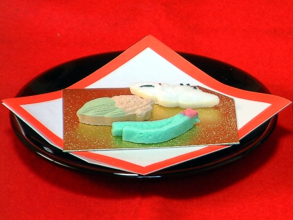 「鶴」「亀」「松葉」「竹」「梅」 など 縁起物 をかたどった お祝い用の干菓子 が、和菓子店にありますので、購入します。