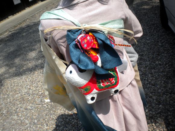 新郎の祖母 が赤ちゃんを抱き、羽織を掛け、その背中の結び目に犬張子をぶら下げます。母親 ではなく 祖母 が赤ちゃんを抱くのは、子育ての疲労から母親を休ませる ためだそうです。