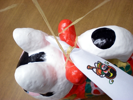 犬張子 の背中の 赤いリボン部分 に、麻をたすき掛けの形にしばり付けます。