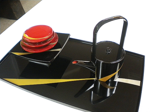 新しく作られた現代的なデザインの屠蘇台です。足の無いトレーのような形状や、下駄の歯のような低い足がついた形状、楕円形や長方形など様々なデザインがあり、銚子や盃台もモダンなデザインになっています。