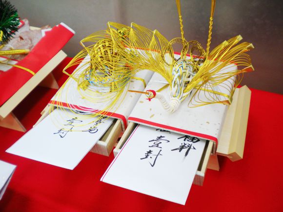 A 結納金を入れる箱や金封に鶴と亀の水引細工が付いている。