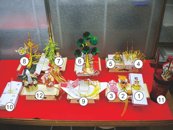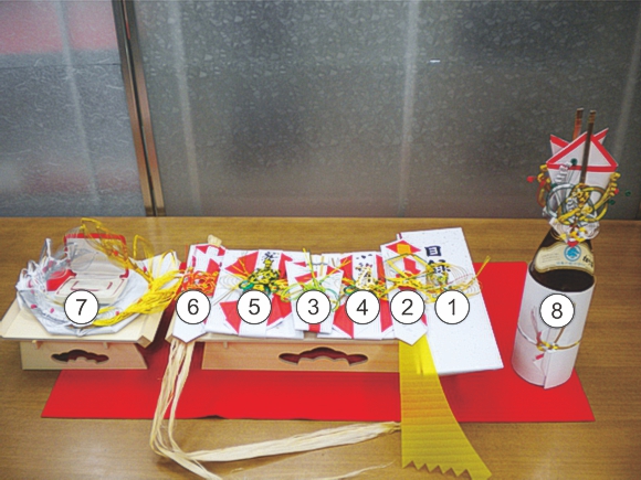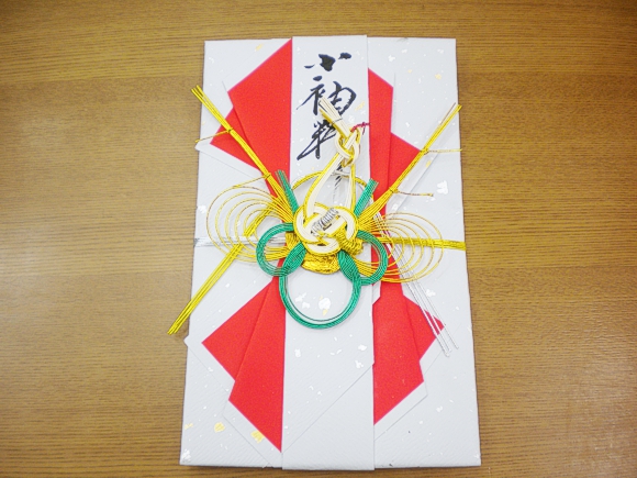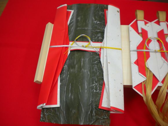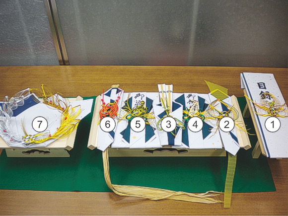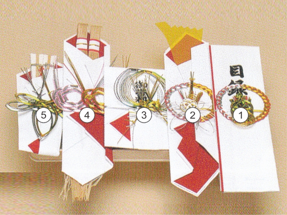 - するめ・昆布 とともに かつお節 を付ける。(現物の代わりにお金を入れる場合もある)