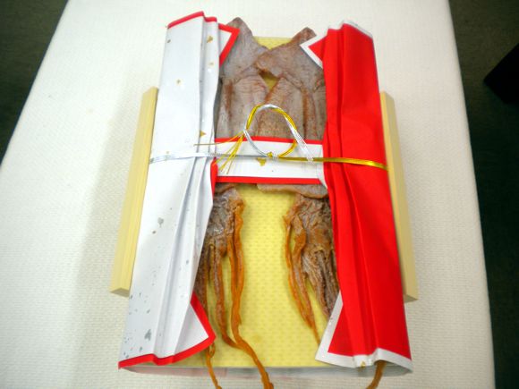 乾物のスルメです。 「生臭もの」として魔よけの意味があり、神事の供え物として用いられることから縁起が良く、また、長く保存できることから「結婚生活が永遠不変である」ことを象徴します。 噛めば噛むほど味が出ることから、年を取るごとに味わいが増すような仲睦まじい夫婦になるようにとの意味もあります。 関東式 の結納では実物の代わりにお金を包む場合もあります。 |
