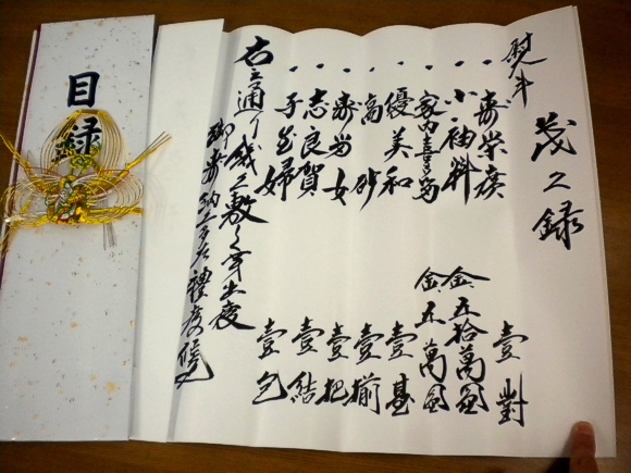女性側は、目録を開いて確認した後、別の白木台にのせた 受書 を男性側へ手渡します。