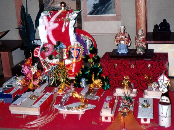 昔 の 中部地方 の結納で最も特徴的な飾り物です。 最近は、着物をあまり着なくなった事と、予算がかかることから、ほとんど用いられなくなりました。 着物の生地などを「宝船」「鯛」「蓬莱山」など縁起の良い形に仕立てたもので、細工を解くと着物の生地や帯紐になり、着物が仕立てられるようになっています。女性側は、婚礼道具の荷入れの際に、荷物を運ぶトラックの荷台の先頭に宝船を飾り付けます。 |