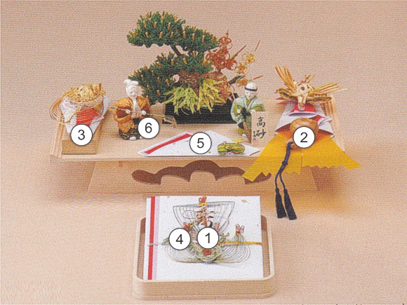 結納 に家族への 「お土産品」 が付いていなくても、結納返し では少なくとも必ず一品は付けます。 - 高砂人形 を付けることが多い。(結納の記念として永く飾る品として)
