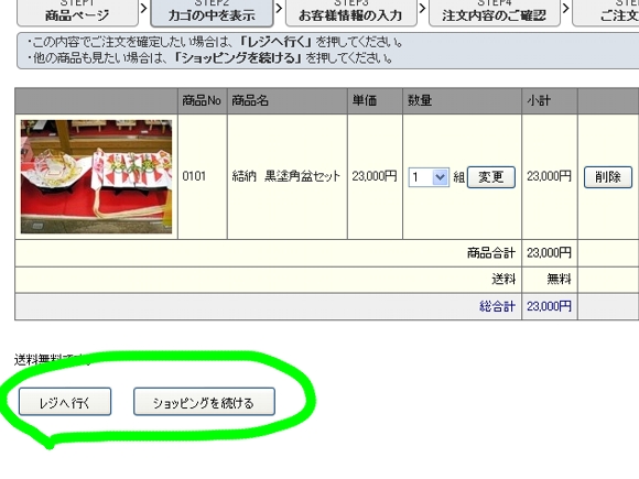 ご購入手続きへ進む場合はレジへ行くをクリックします。