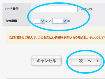 M クレジットカードのカード番号と有効期限を入力し、次へをクリックします。
